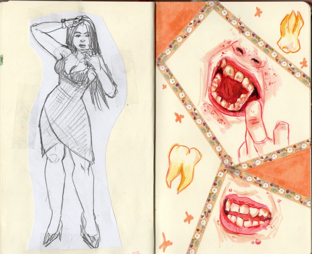 This is not my mouth by the way lol. I was so focused of my mouth being in pain that I decided to draw images of teeth. I found some references online that felt raw and went with it. It was inspired by my own experience. I also did a super quick drawing of a lady on the other page, again, with zerooooo expectation. No trying to make it good. Just putting pen to paper.