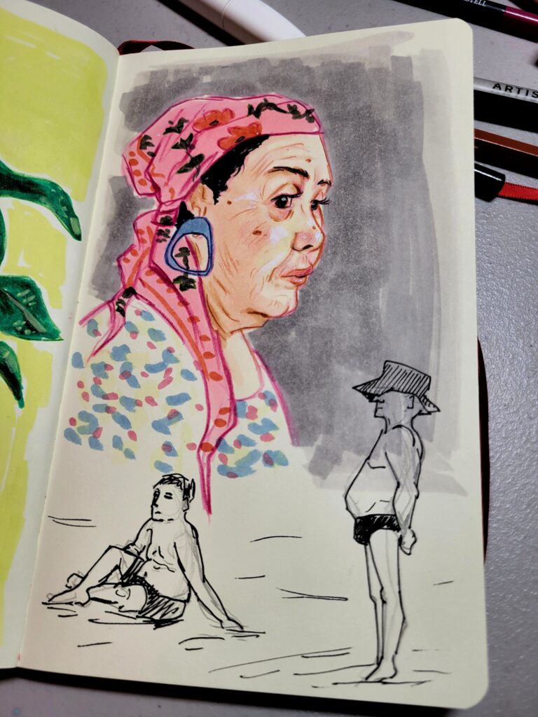 I enjoyed drawing this lady. I used my Ohuhu markers and maybe some leftover touch markers as well. To fit the theme I added the man chilling by the beach with his gut out and his hands behind his back. This feels like a real life scene!