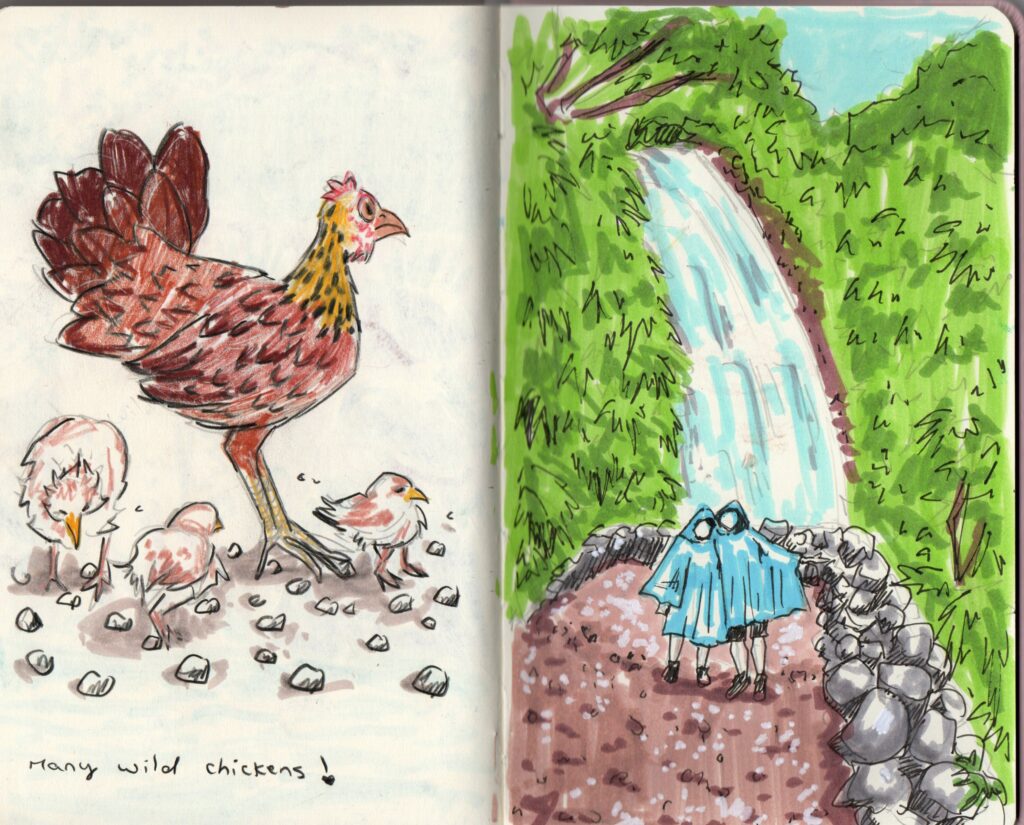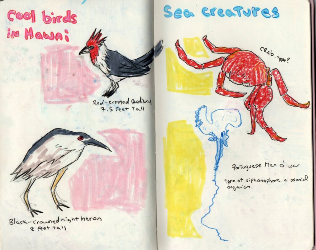 Aside from the gorgeous views, I loved seeing all the local animals! I drew some I had the pleasure to see!! Well except the marine creature. We were in the waters at the beach and we thought a random blue string was floating then it stung my boyfriend and we realized it was a creature. I then googled and realized it is called a Portuguese Man o’war. I had to draw it and put it in my sketchbook. What an encounter!