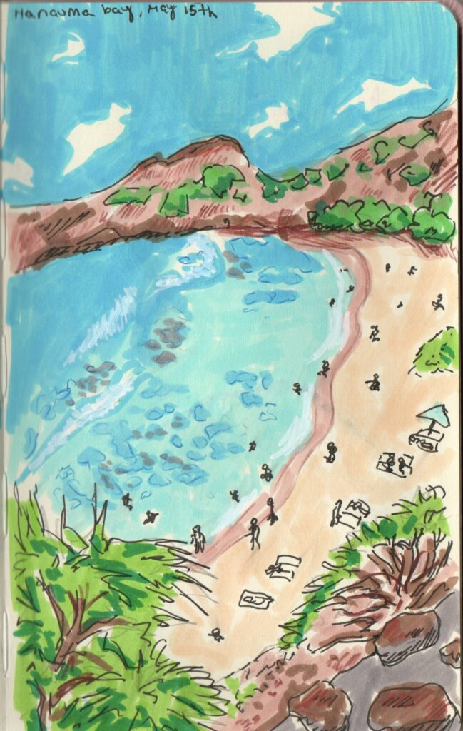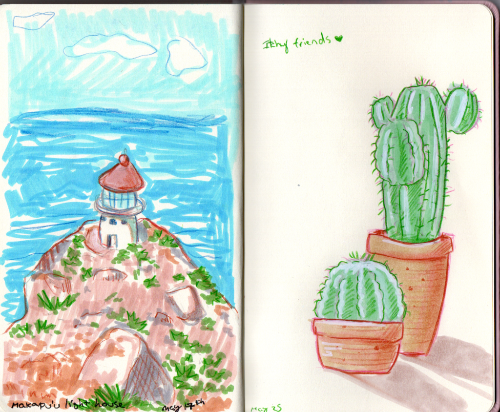 Last year, in may, I went to Hawaii with my boyfriend. This was such a beautiful trip. Some of the best sights I have seen in my life and probably the best food I ever had. everything was so fresh! I knew I wanted to draw during my vacation but I also did not want to spend too much time on each drawing because I would rather enjoy the vacation itself. I realized that quick sketches could perfectly encapsulate the vibe/the feeling of what was happening around me!