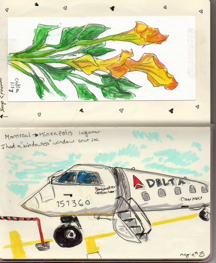I remember drawing this place and thinking oooooofff, i really messed up the proportions there ahah! But I was tired, up since 2AM and exited about arriving to my trip. It was my current reality. Also I wrote that I had a windowless window seat because that was the case. It was the first time it happened to me and I found that funny. Now I’ll remember this silly fact forever.